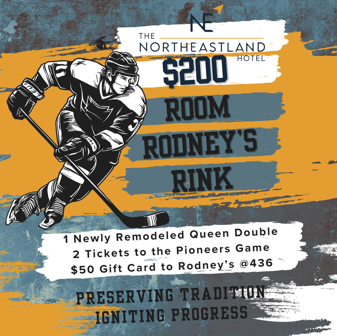 Our exclusive Stay & Play Package includes:Presque Isle Pioneers Tier II Junior Hockey game ticketsComfortable, stylish accommodations at The NortheastlandDinner at Rodney’s—Presque Isle’s landmark dining spot📅 Perfect for families, friend groups, or a nostalgic night out.